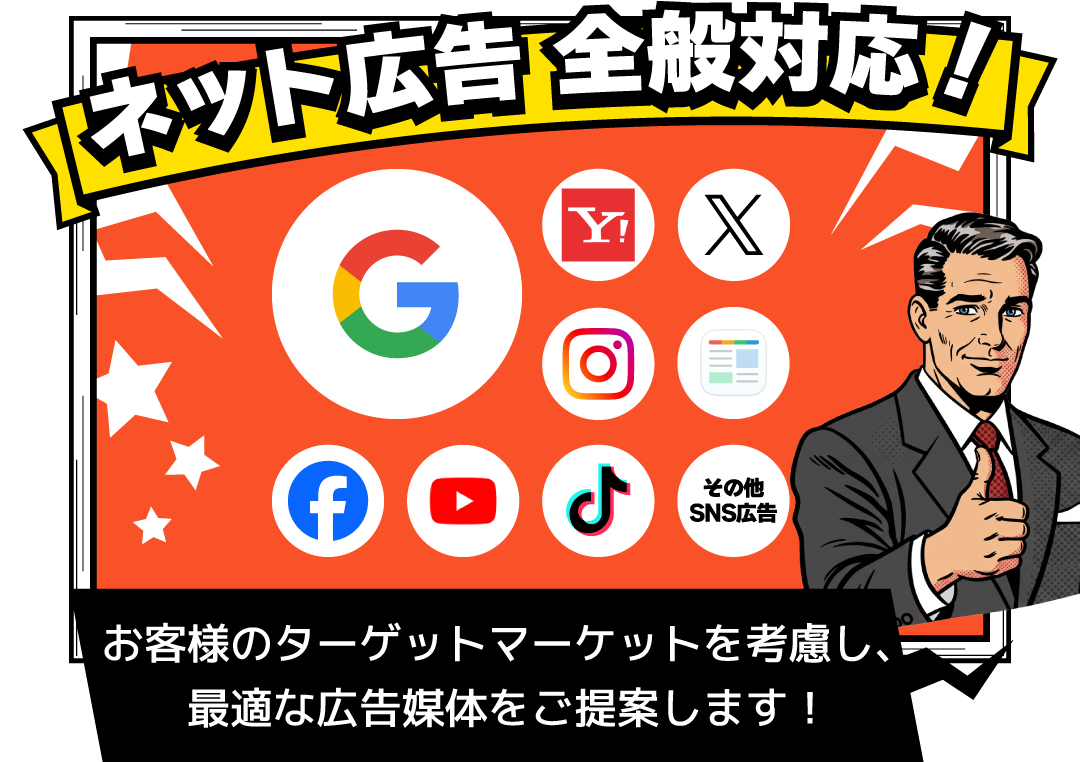 | 広告テキスト | 原則無料 | 見出し・説明文などを作成します。 広告の本数が多い場合などは別途追加費用が発生する場合があります。 |